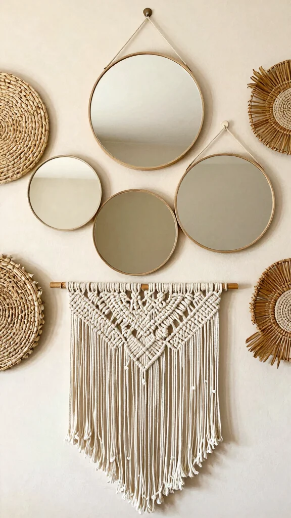 Pair your three circle mirrors with textures and greens that suit Bohemian taste. Consider a mix of decorative mirrors with wall decor ideas like macramé hangings, woven textiles, trailing plants, or a small shelf to display trinkets. Keep a unified color palette—earth tones, terracotta, and brass tones harmonize well. Add ambient lighting—string lights or a wall lamp—to reflect in the mirrors and pull the look together. This is a practical way to apply interior design tips for modern home accents without overcrowding the wall.