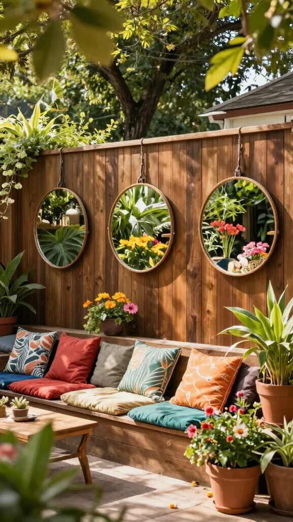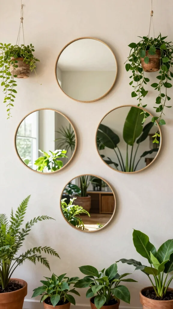 Surrounding your circle mirrors with lush green plants creates a vibrant, organic look that enhances your bohemian decor. This technique emphasizes the natural beauty of both the mirrors and the foliage, fostering a soothing atmosphere perfect for relaxation. The combination of circular shapes and leafy textures generates inviting visual harmony.