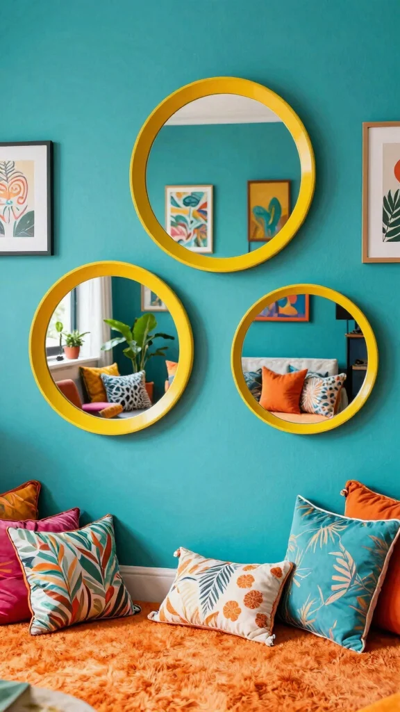 To implement this color coordination effectively, consider painting a bold accent wall and selecting mirrors with frames that complement this choice. Accessorize with items in similar hues to enhance your theme, and don’t shy away from bold contrasts to create visual excitement.