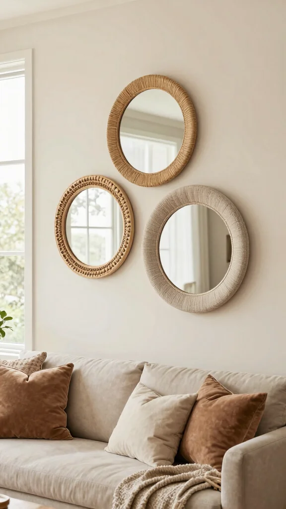 Incorporate texture into your decor with three round mirrors featuring tactile frames—think woven, beaded, or fabric-covered options. Hanging them in a cluster creates a stunning focal point that adds depth to any room.