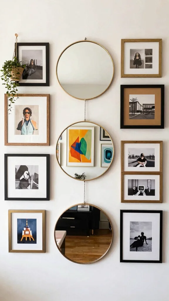 Finally, assemble a full gallery wall that features three round mirrors as central pieces. Surround them with framed art, photos, and prints for a curated, artistic atmosphere. This setup is perfect for showcasing your creativity and personal style!