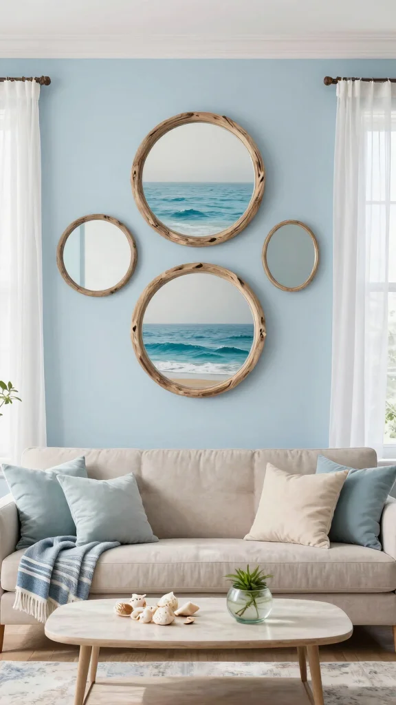 Coastal charm proves that 3 round mirrors on wall ideas can create instant breeziness above a light sofa. Use driftwood or rattan frames for warmth, then pair with airy neutrals to invite calm and easy, everyday serenity.