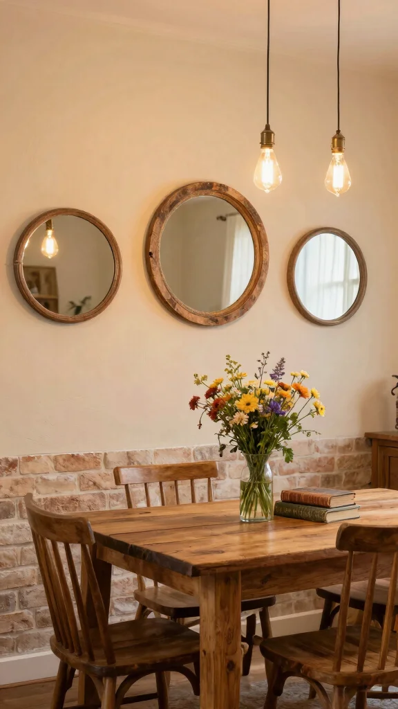 3 round mirrors on wall ideas can turn a plain dining nook into a cozy Rustic Retreat. Use reclaimed wood frames and warm tones to spark charm—plus, they bounce light for a brighter, inviting space.