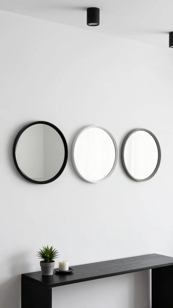 For a sleek, ultra-modern look, decorate your wall with three round mirrors in a monochrome palette. Black, white, and grey frames create a striking visual that embodies simplicity and elegance, ideal for minimalist interiors.