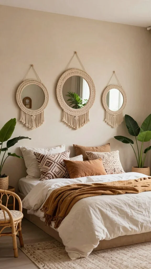 Create a dreamy bohemian atmosphere with three round mirrors featuring boho-chic frames made from macrame or woven materials. Placing them in a cozy nook or above a bohemian-style bed introduces a laid-back, inviting feel.