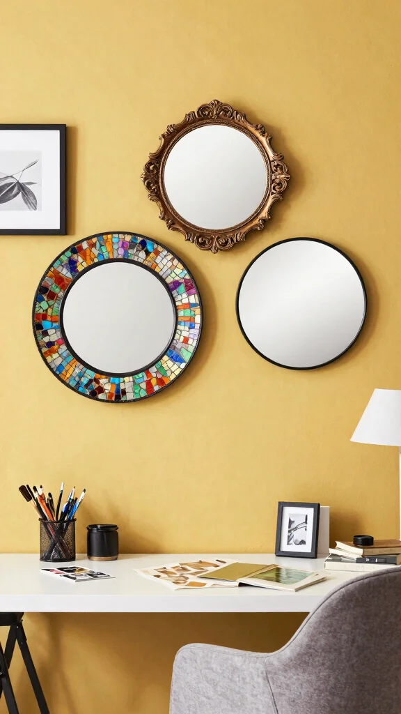 Brighten your room with a playful trio of round mirrors in vibrant colors. This fun approach is ideal for kids’ rooms or creative spaces, injecting a burst of energy into any decor scheme.