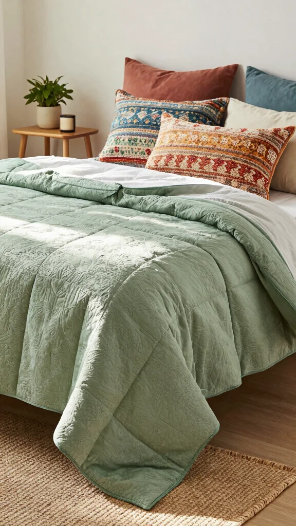 – Use a sage quilt as a base layer for style