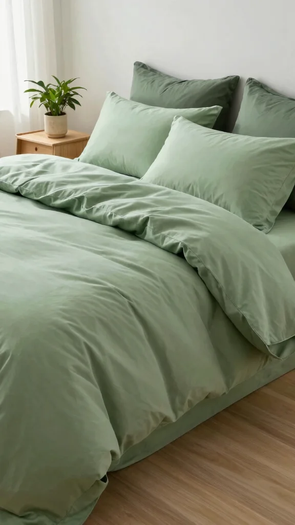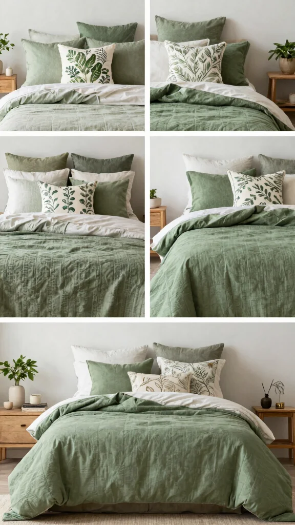 Choose green bedding sets in calming greens, earthy neutrals, and natural textures to boost cozy bedroom decor vibes.