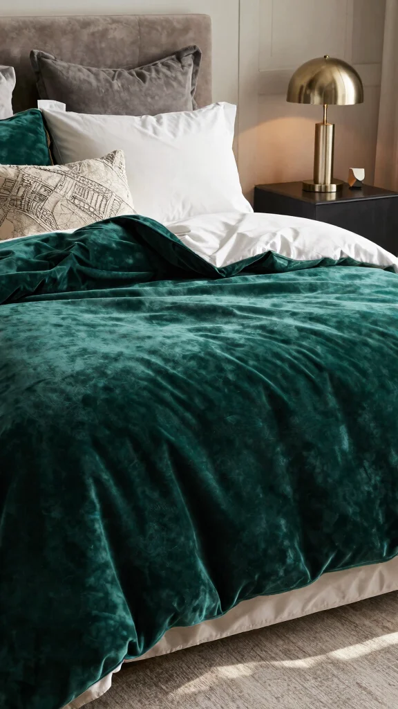 Pairing an emerald velvet comforter with lighter sheets creates a stunning contrast that draws the eye. Many options are available at various price points, allowing you to find a comforting piece that fits your style.
