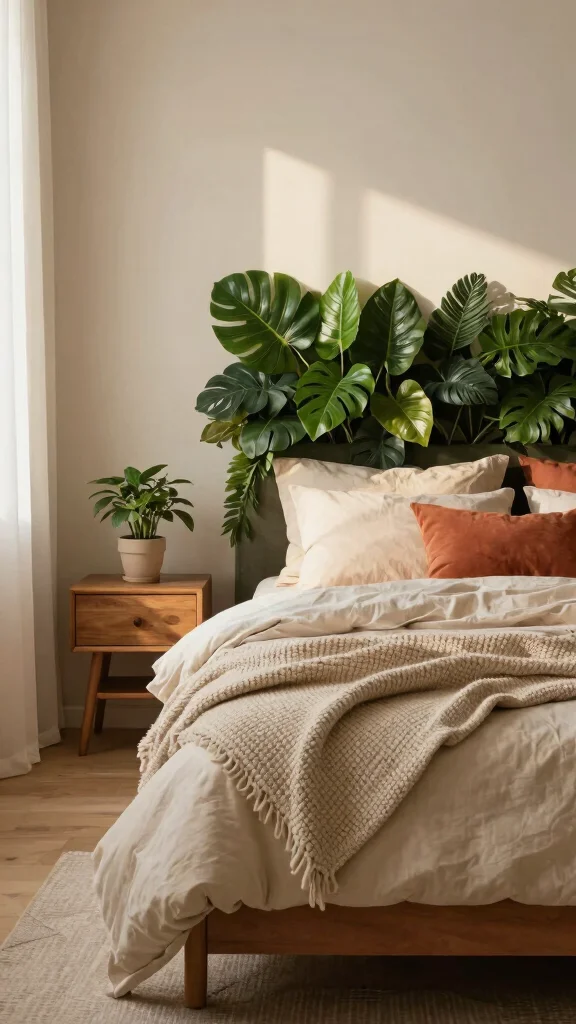Embrace the warmth of earthy tones paired with a leafy green headboard, creating a serene bedroom atmosphere that feels both inviting and grounded. The combination works beautifully, as the soft greens harmonize with natural beige and terracotta bedding, giving your space a cozy yet vibrant touch. Incorporate materials like organic cotton and linen to enhance comfort, while wooden accents add a rustic elegance, inviting nature indoors. Adding plants not only ties in the organic theme but also breathes life into your decor, fostering a tranquil retreat.