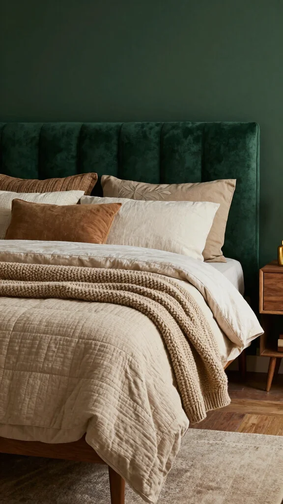 Embrace a cozy ambiance with a hunter green headboard that adds depth and richness to your bedroom. Pair it with a variety of textured bedding, such as chunky knit blankets and soft sheets, to create a comfortable escape. Incorporating shades of green and natural materials makes the room feel cohesive and inviting. Warm wood accents alongside golden decor enhance the rich tones of your bedding and headboard, creating a harmonious look.