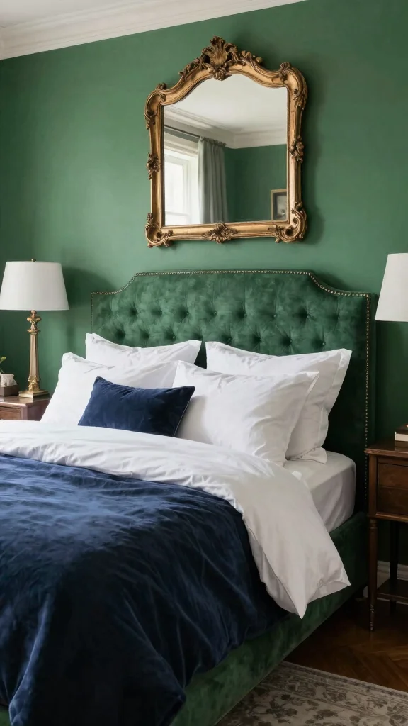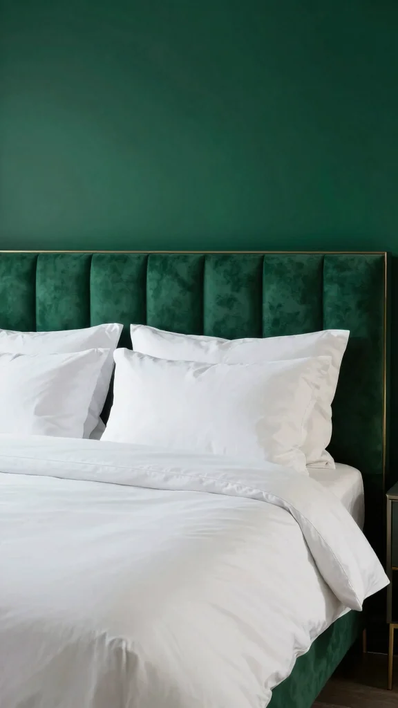 Create an atmosphere that exudes subtle luxury with an emerald green headboard paired with crisp white bedding. This timeless combination offers sophistication without being overly extravagant, making it perfect for any bedroom. Choose high-quality fabrics like silk or high-thread-count cotton for the bedding, enhancing both comfort and elegance. Accents in gold or silver can elevate the luxurious feel, giving your space a refined ambiance. This style appeals to those who enjoy understated yet elegant designs.