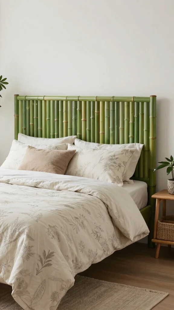 Infuse your bedroom with the essence of nature through a bamboo green headboard that exudes tranquility. Choose bedding in neutral tones or subtle botanical prints to create a serene vibe that complements the headboard. Incorporate natural materials like wood and stone to enhance the organic feel, while plants breathe life into the space. This design is perfect for those who want to create a calming, nature-inspired retreat at home.