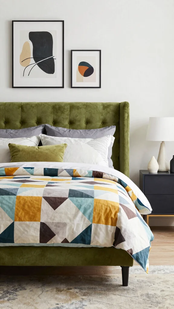 Finish your bedroom with a trendy green headboard paired with geometric bedding for a modern twist. Mixing shapes and colors creates a dynamic visual experience, making your space feel fresh and current. Choose a combination of vibrant and muted tones in your bedding that harmonizes with the headboard, ensuring a balanced look. Incorporate modern decor elements like abstract art or sculptural accessories to enhance the trendy vibe, making your room feel lively and inviting. This style is ideal for those who love to stay ahead of home decor trends.