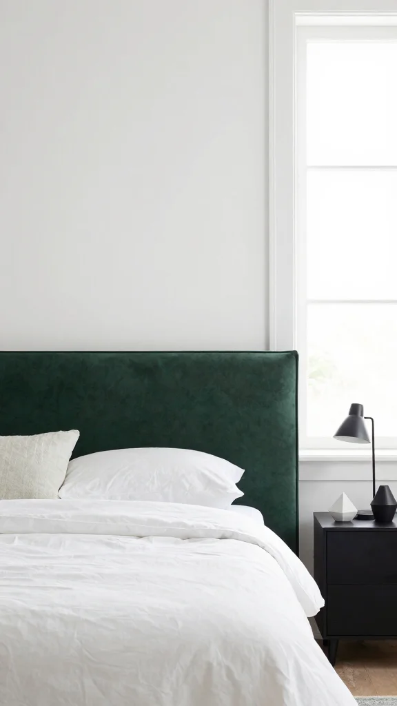 For a chic and modern aesthetic, a deep forest green headboard brings a sophisticated touch to your bedroom. This rich hue beautifully contrasts with crisp white bedding, crafting a fresh and clean look that feels effortless. Enhance the minimalistic vibe with sleek black metal lamps and geometric decor, ensuring that your design remains uncluttered yet elegant. Perfect for smaller spaces, this style showcases simplicity without compromising on charm. Consider bedding made from recycled materials to maintain an eco-friendly approach.