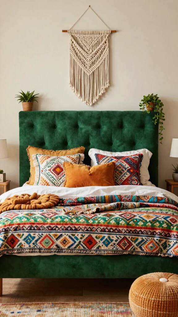 Dive into a world of bohemian bliss with a green tufted headboard that adds a playful whimsy to your bedroom. Layer this statement piece with vibrant bedding, mixing eclectic patterns like florals and geometrics to create a lively atmosphere. Soft, textured throws and an array of colorful cushions elevate comfort while inviting creativity into the design. By integrating natural wood elements and plants, you enhance the organic feel, making the space cozy and inviting. This bohemian style encourages you to express yourself through color and texture.