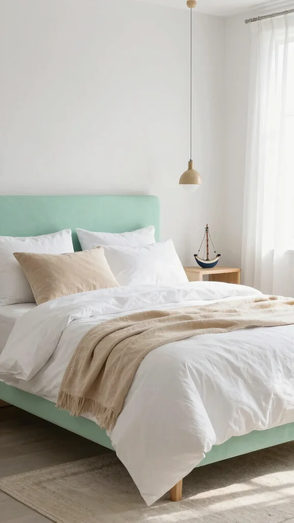 Bring the soothing essence of the coast into your bedroom with a mint green headboard that evokes a sense of tranquility. Soft, sandy beige or crisp white bedding grounds the mint accents, crafting a serene and airy atmosphere. Add elements like seashells, driftwood, or nautical-themed decor to complete the coastal vibe, ensuring a balance between gentle colors and natural textures. This style invites relaxation, reminiscent of a breezy beachside escape.