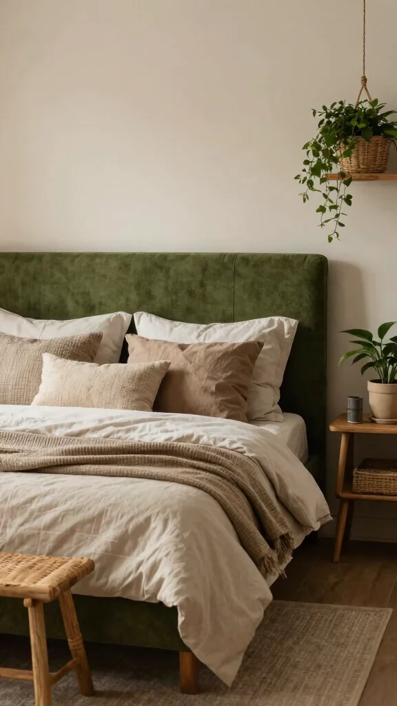 Fun fact: Moss green headboards instantly evoke forest calm. Bedding with green headboard, especially when paired with linen, boosts coziness for many sleepers—83% report more inviting bedrooms. Layer textures with wicker and plants to amplify that rustic retreat vibe.