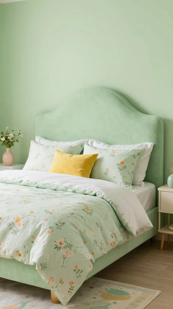 Add a delightful whimsical touch to your bedroom with a pastel green headboard that infuses a playful vibe. Selecting light, airy bedding in complementary pastel shades creates a dreamy palette that feels inviting. Incorporate floral prints or delicate lace to enhance character and charm. Bright accents in decor, such as vibrant throw pillows or quirky wall art, can further enrich the whimsical theme, ensuring a cohesive and joyful look. This style is perfect for those who embrace creativity in their decor.