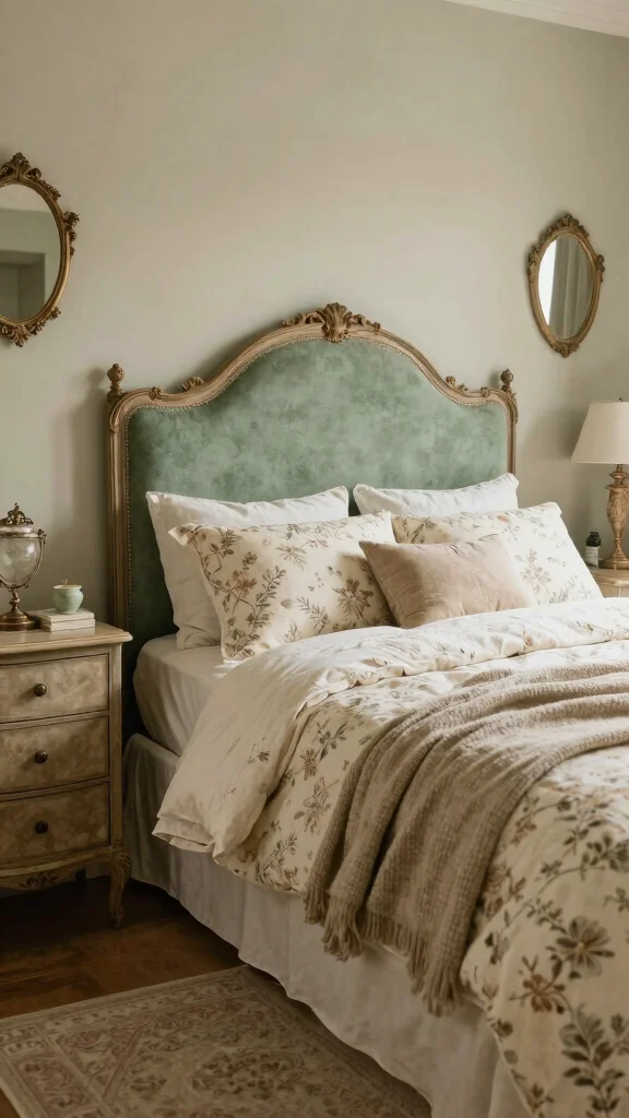 For a warm vintage feel, a sage green headboard can serve as the centerpiece of your bedroom design. Pair it with vintage-inspired bedding featuring floral patterns or soft stripes to enhance the nostalgic ambiance. Incorporate frayed edges and gently worn fabrics for added character and comfort. Accessorizing with antique furniture or decor pieces creates a story within your space, reflecting your personal style. This look is ideal for those who cherish the charm of bygone eras.