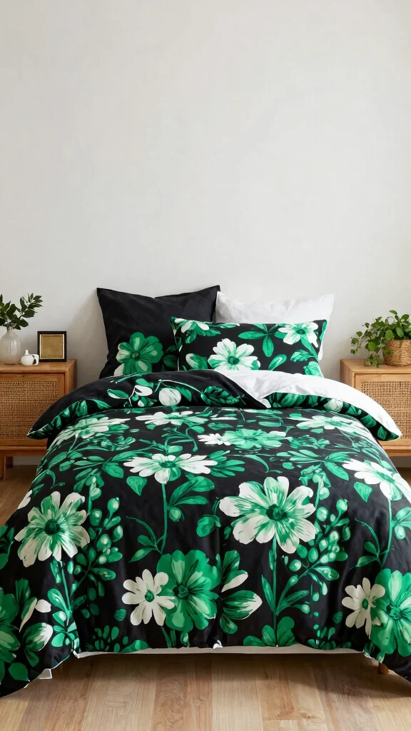 For a vibrant and fresh approach to modern style, opt for bedding with bold floral patterns in black and green. These lively designs infuse energy into your space while maintaining an eco-friendly ethos. Seek out florals with a contemporary edge, such as oversized blooms or abstract shapes. This style pairs beautifully with light wood furniture for a casual yet chic look.