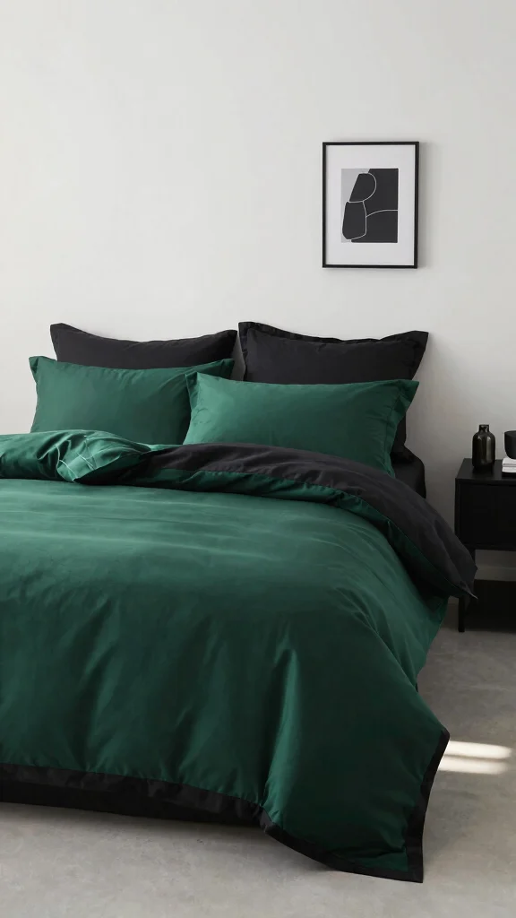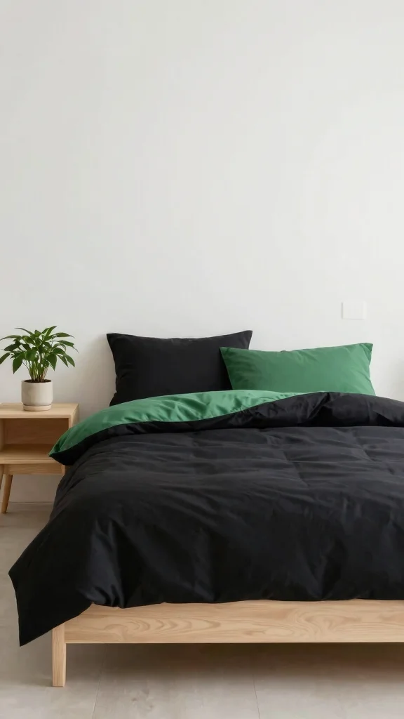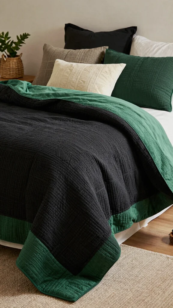 Fun fact: Homes with monochrome black and green bedding report a 30% quicker sense of calm due to cohesive color blocks. Mix satin with jersey—durable, sustainable fabrics—for comfort and shine without clutter.
