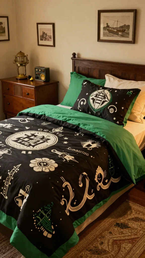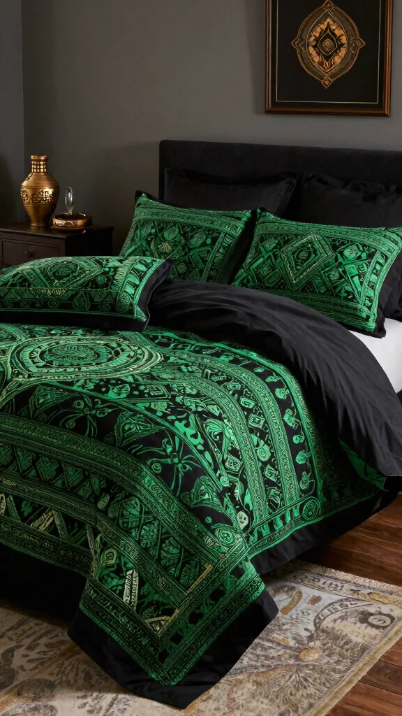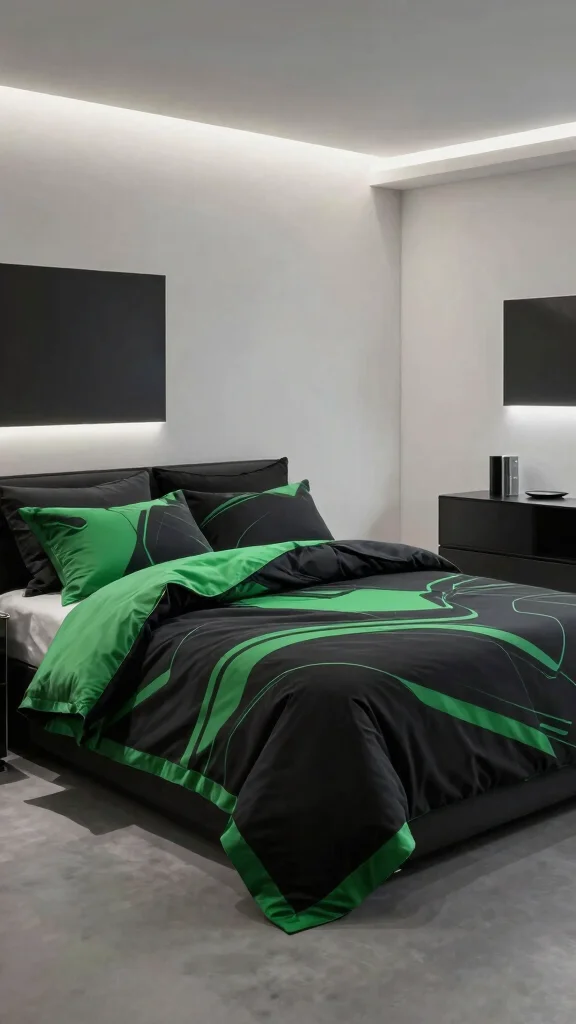 Infuse a futuristic vibe into your bedroom with sleek, modern black and green bedding. Look for designs that feature innovative patterns or materials, like metallic accents against rich greens and blacks. This contemporary style makes a bold statement, refreshing your space with a touch of innovation. Pair this bedding with modern furniture and technology-inspired decor for a cohesive aesthetic.