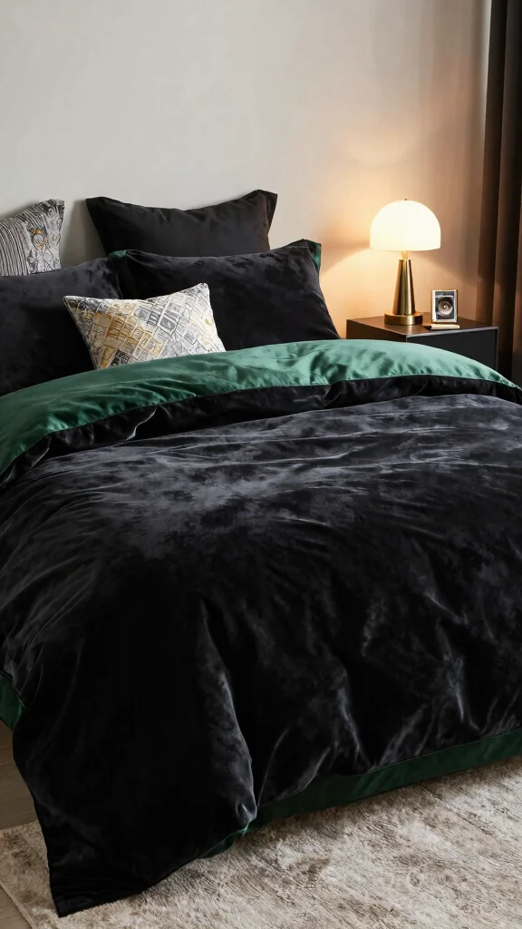 Indulge your senses with the luxurious feel of black and green bedding made from soft velvet. This sumptuous texture invites warmth and richness, transforming your bed into the ultimate cozy retreat. Velvet not only looks stunning but also provides incredible comfort, making it perfect for snuggling on chilly nights. Opt for deep green shades paired with classic black for an elegant touch.