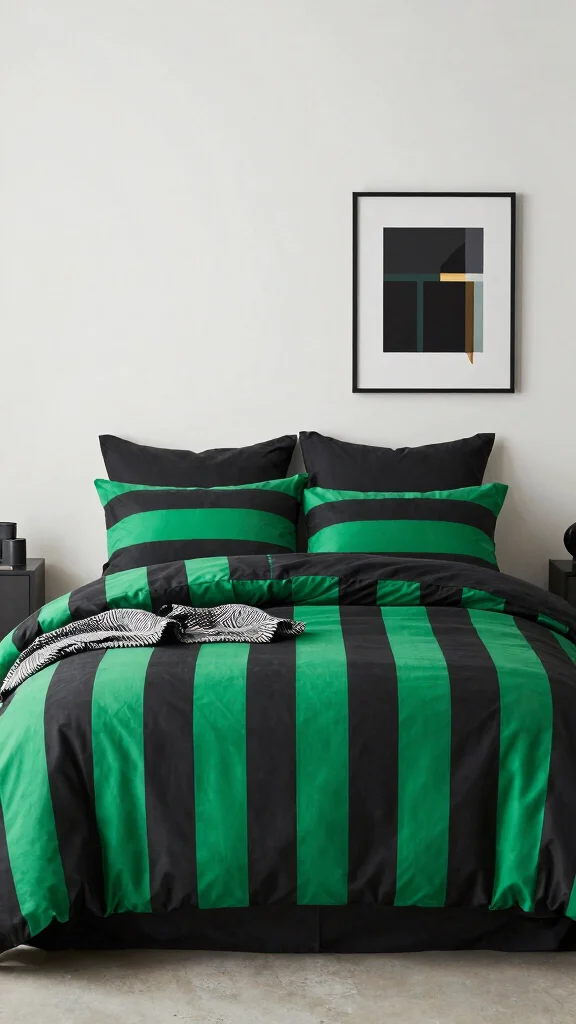 Add a vibrant sense of energy to your bedroom with black and green striped bedding. Whether arranged vertically or horizontally, stripes can transform your bed into a stylish focal point. This pattern is particularly effective in modern decor, projecting a contemporary vibe. Balance your striped bedding with solid-colored throw pillows to create a visually pleasing contrast.