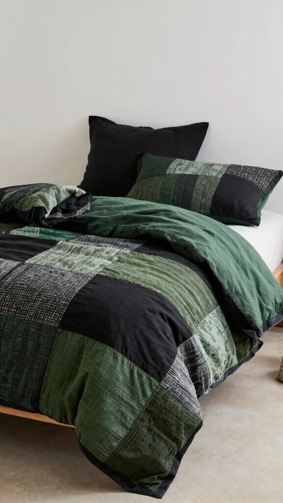 Showcase your creative side with patchwork designs in black and green bedding. This style is perfect for those wanting to express their eclectic taste while adding warmth and personality to their space. Patchwork bedding can feature a mix of fabrics and patterns that harmonize beautifully in shades of black and green. Layering different textures creates a cozy and inviting atmosphere.