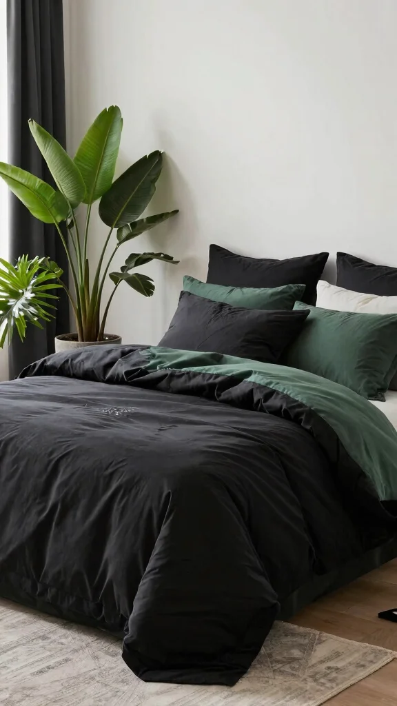 Layering various textiles can create an inviting, dynamic look with your black and green bedding. Combine materials such as cotton, linen, and knits for a cozy atmosphere that adds visual interest. This technique allows you to experiment with textures and colors while achieving a curated, stylish aesthetic. For example, pair a soft green duvet with a black knitted throw, mixing pillows in different patterns and textures.