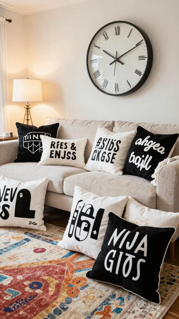 Inject a playful spirit into your space with throw pillows that feature modern typography. Black and white pillows displaying bold quotes or quirky sayings can add humor and personality to your decor. These pillows serve as artistic statement pieces that resonate with your values and mood, making them especially fitting for casual areas like family rooms.