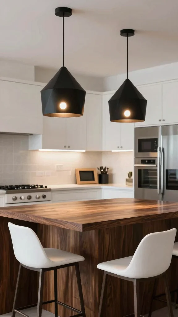 Bold black pendant lights can become striking focal points in your kitchen, adding instant character and style. Their sleek, modern designs create a beautiful contrast against lighter surfaces, enhancing visual appeal. Imagine a cluster of oversized pendants hanging above your kitchen island, providing both illumination and a contemporary edge, or a simple, elegant pendant that stands out in a dining area.
