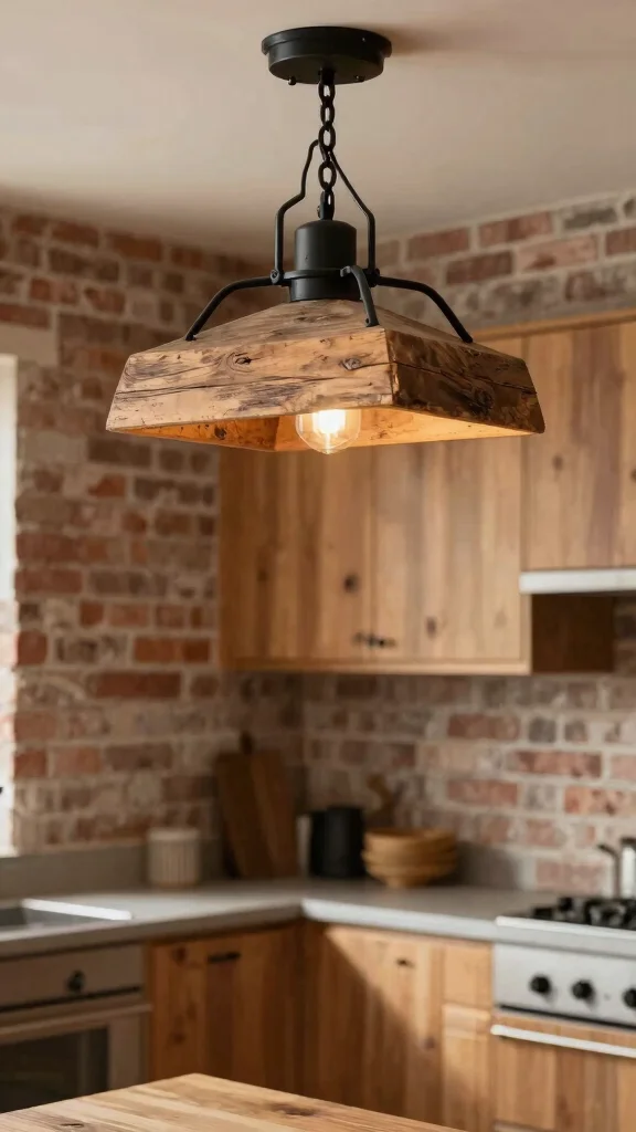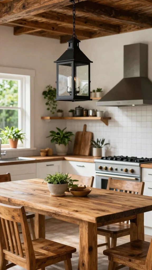 To achieve this look, incorporate other natural materials in your kitchen, such as wood and stone, to enhance the lighting’s rustic feel. Choose fixtures with a weathered finish to amplify the charm, and layer various lighting types to create warmth and depth.