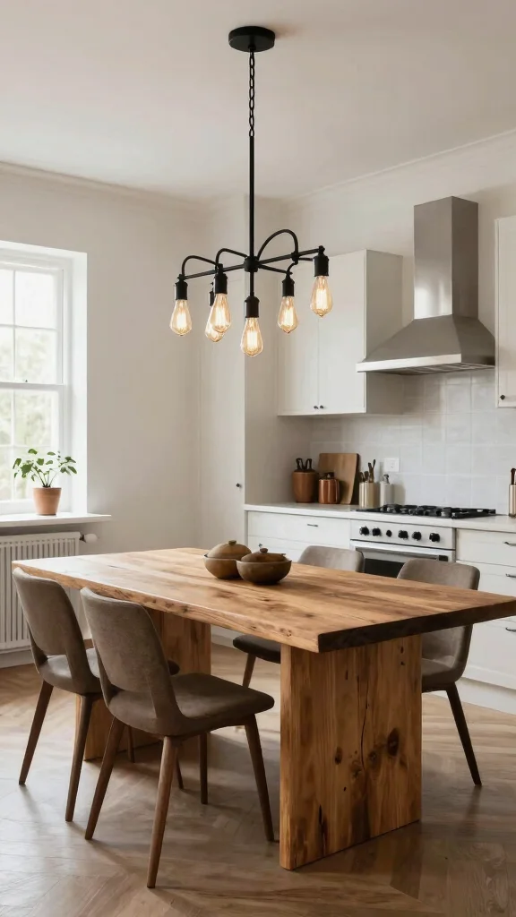 Chandeliers can bring unexpected elegance to your kitchen, especially when styled in an industrial fashion. A black chandelier with exposed bulbs offers a unique blend of modern flair and vintage charm, making it a standout element above a dining table or kitchen island. This bold choice creates a focal point that enhances your kitchen’s character and warmth.