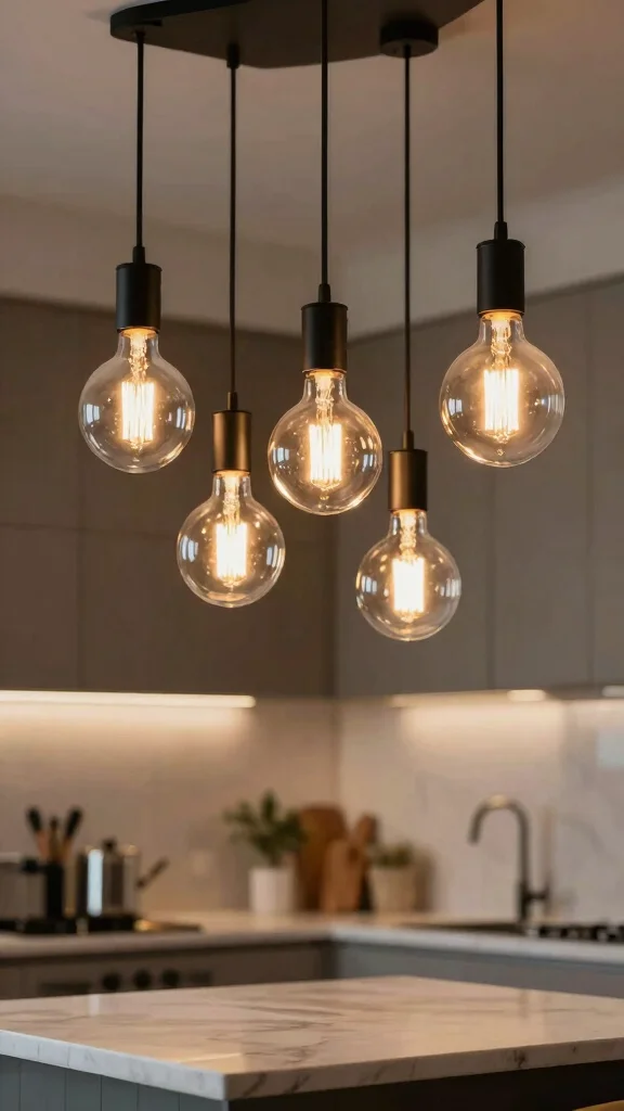 Ensure the pendants are scaled to your island length (roughly one fixture every 2–3 feet) and hang about 30–34 inches above the countertop.