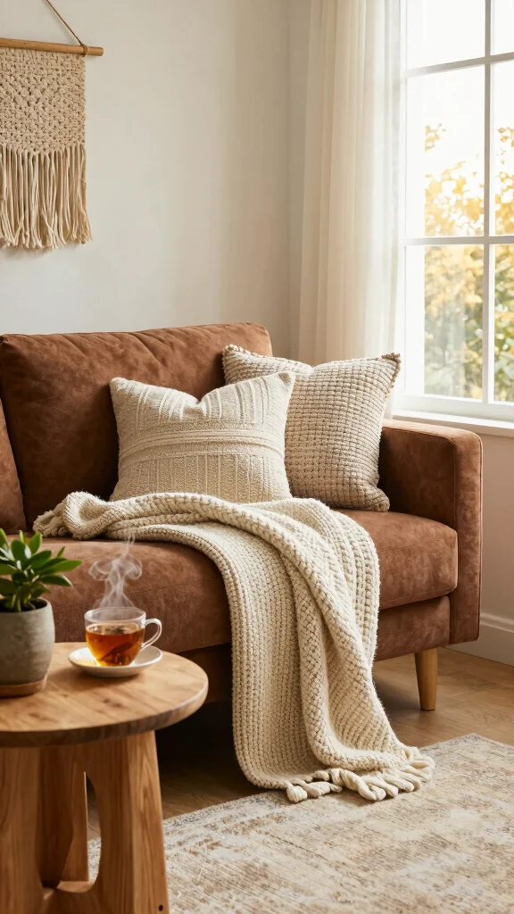 Textured knit pillows bring a warm, inviting touch to your brown couch, enhancing its cozy appeal. These pillows create visual interest by incorporating varying shades of brown, cream, and subtle greens, fostering a sense of harmony in your space. The tactile nature of knit fabrics invites relaxation, making them perfect for snuggling up with a good book or movie.To implement this look, consider mixing different knitting patterns to add depth. Layer them with smoother pillows for a balanced aesthetic, and arrange larger pillows at the back with smaller ones in the foreground for a dynamic display.Consider these tips to elevate your decor: