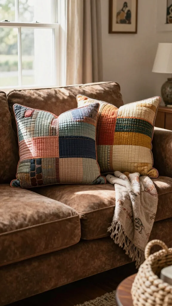 Quilted pillows made from recycled fabrics can introduce vibrant patterns and comfort to your brown couch. These unique pillows often feature patchwork designs, telling a story of sustainability and creativity. Their diverse textures and colors add a playful element to your seating area, making it feel lively and inviting.For styling, use quilted pillows as accent pieces to create a layered look. Combine them with solid-colored pillows to let the patterns take center stage in your decor.Try these ideas to elevate your space:
