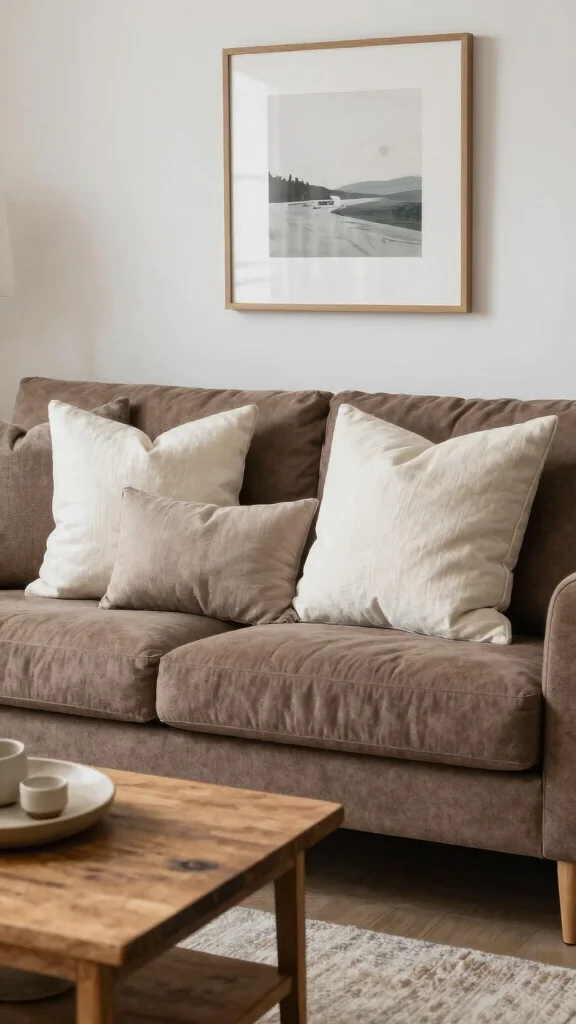 Minimalist linen pillows offer a clean and serene look for your brown couch. Their simple design and natural texture create a calming atmosphere, making them ideal for modern or Scandinavian-inspired spaces. The breathability of linen adds comfort while maintaining a stylish appeal.To achieve this look, stick to soft neutral colors like white, cream, or light gray for a soothing effect. Oversized pillows can make a strong impact while ensuring comfort in your seating arrangement.Here are some tips for your minimalist decor: