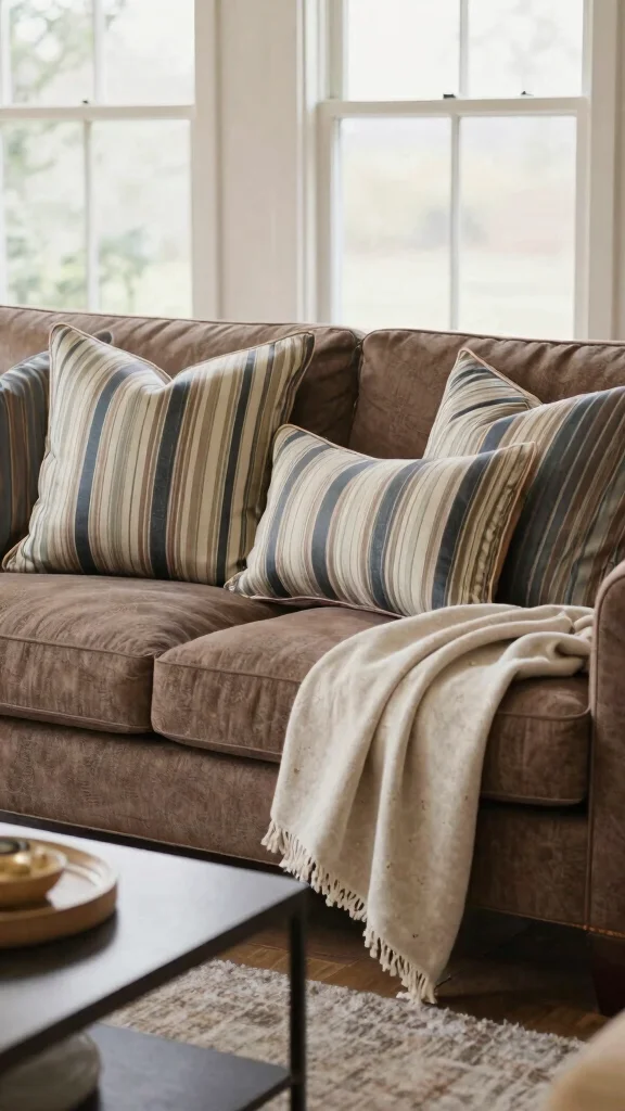 Striped pattern pillows can effortlessly add a timeless touch to your brown couch. Their classic designs create a sense of order and balance, making them a perfect fit for structured design aesthetics. Stripes can elongate the visual appeal of your couch, contributing to a spacious feel in your living area.For styling, mix vertical and horizontal stripes for a dynamic effect, and combine them with solid pillows to enhance their visual impact. Ensure that the colors either contrast with or complement your couch to maintain a cohesive design.Explore these key insights for your decor:
