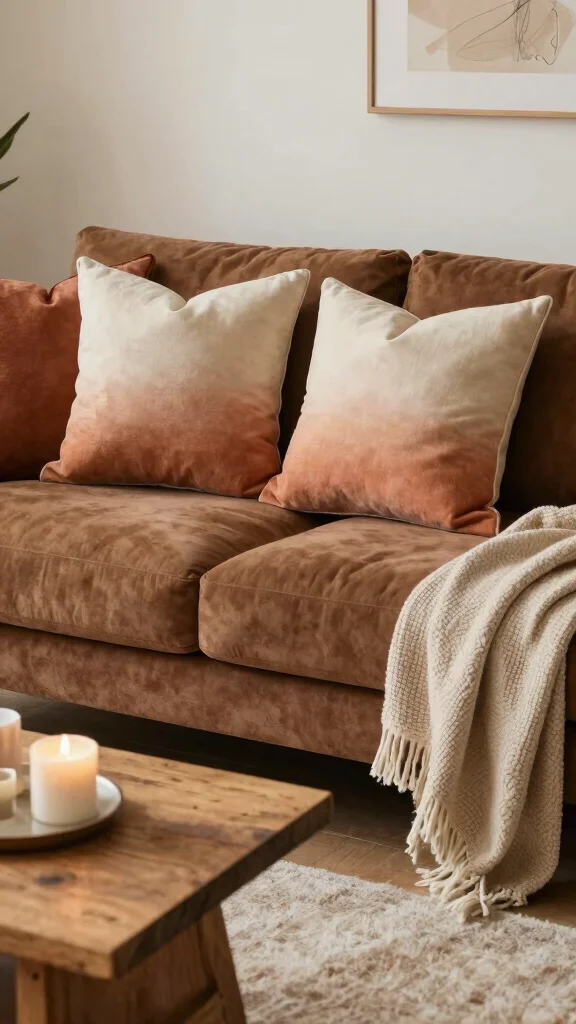 Ombre design pillows can create stunning visual effects on your brown couch with their beautiful gradient transitions. This design imparts a sense of movement and fluidity to your decor, making your living space feel dynamic and engaging. The blend of colors can also enhance the warmth of your couch, creating a cozy atmosphere.For styling, combine ombre pillows with solid colors that match the lighter or darker shades in the design. This will tie together various elements of your room’s palette, creating a harmonious look.Explore these ideas for incorporating ombre:
