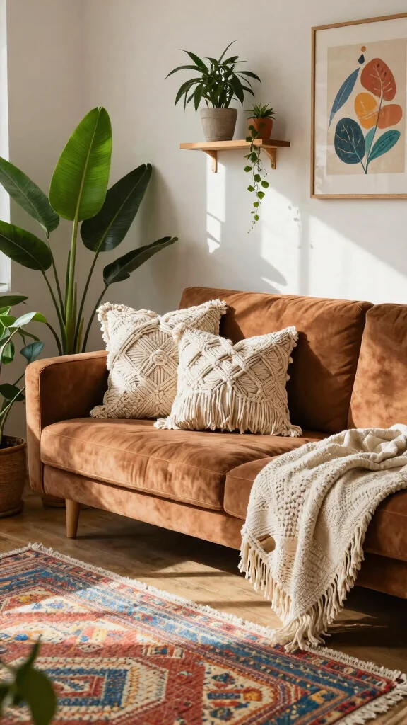 For a touch of bohemian flair, macrame pillows are a delightful addition to your brown couch. Their intricate knot designs and unique textures create stunning focal points that embody artistry and warmth. The natural fibers often used lend an earthy feel, allowing you to embrace a relaxed, inviting atmosphere in your living area.To style effectively, pair macrame pillows with solid-colored options to prevent visual overload. Incorporate a variety of sizes and shapes for an eclectic vibe, and consider using materials like jute to enhance the natural feel.Explore these ideas for incorporating macrame: