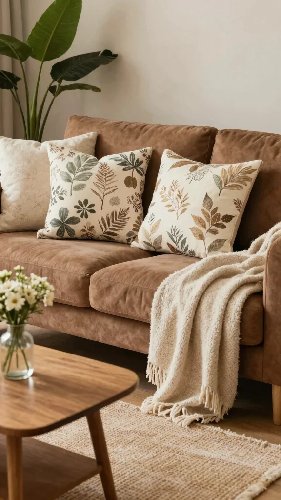Earthy patterned pillows can beautifully enhance the natural charm of your brown couch. Selecting designs with motifs like leaves or florals in colors such as terracotta, muted greens, and soft creams evokes a connection to nature. These pillows create a storytelling element in your decor, inviting a sense of tranquility and warmth.For styling, use bold patterned pillows as accent pieces surrounded by solid colors. Layer various patterns and textures to create a cohesive look, ensuring a balance with neutral tones to ground the design.Consider these tips for your pillow arrangement: