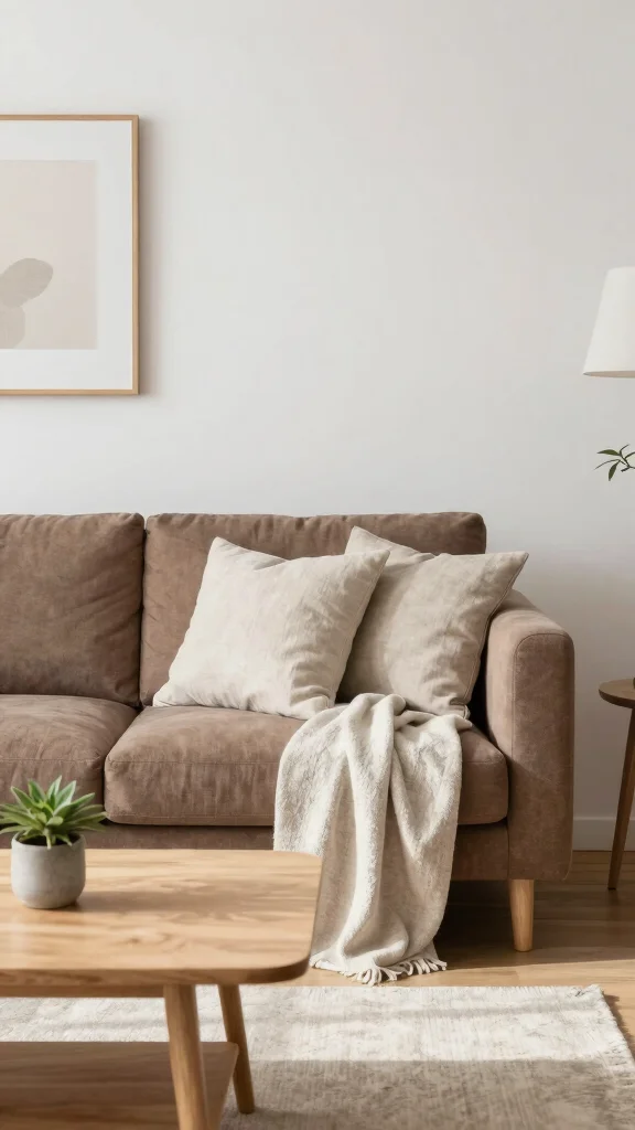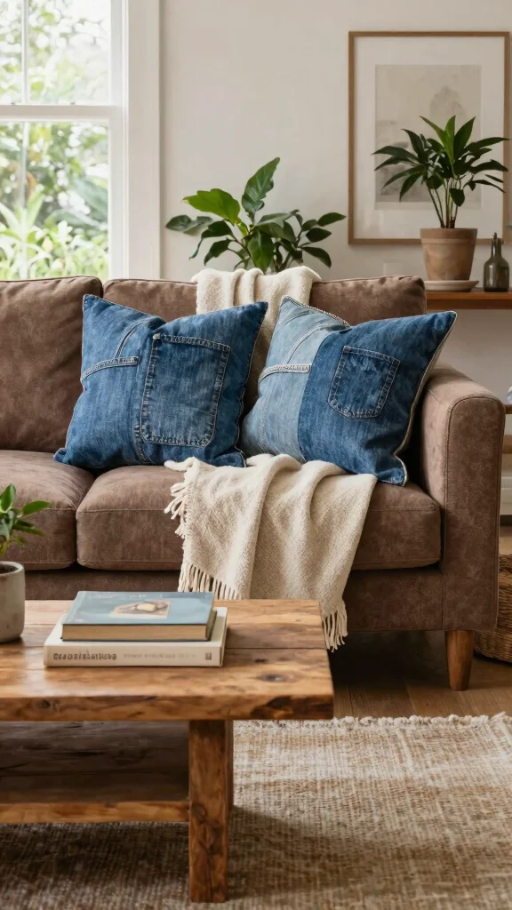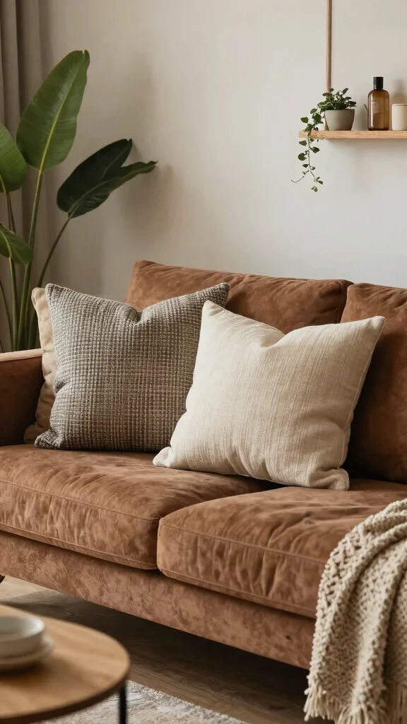 Recycled denim pillows are a trendy and sustainable choice that adds a casual vibe to your brown couch. Their sturdy fabric not only provides durability but also enhances the relaxed atmosphere of your living room. Denim’s versatility allows for playful experimentation with styles, making it an excellent option for any decor theme.For effective styling, pair denim pillows with elegant textiles like linen or velvet to create a beautiful contrast. Their robust nature allows for mixing different shades to create a dynamic look, while adding patterned throw blankets can enhance comfort.Incorporate these ideas to elevate your space: