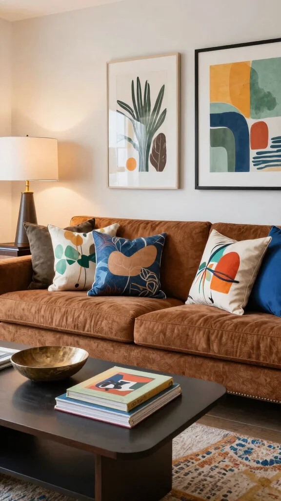This lively approach not only enhances your brown couch but also encourages creativity, making your home a vibrant reflection of your personality.
