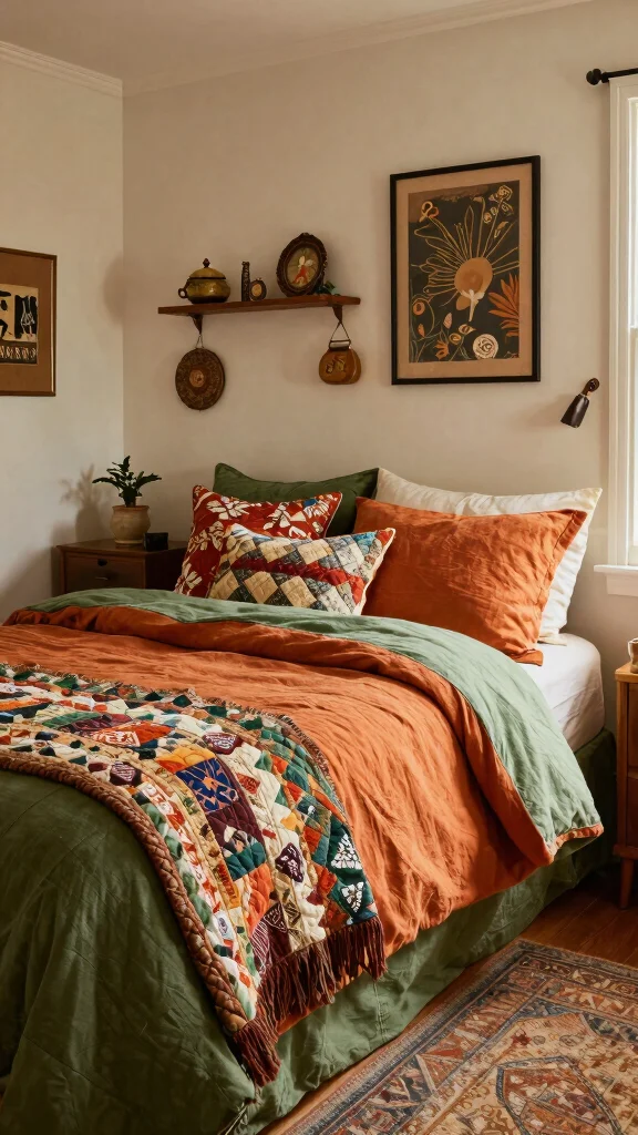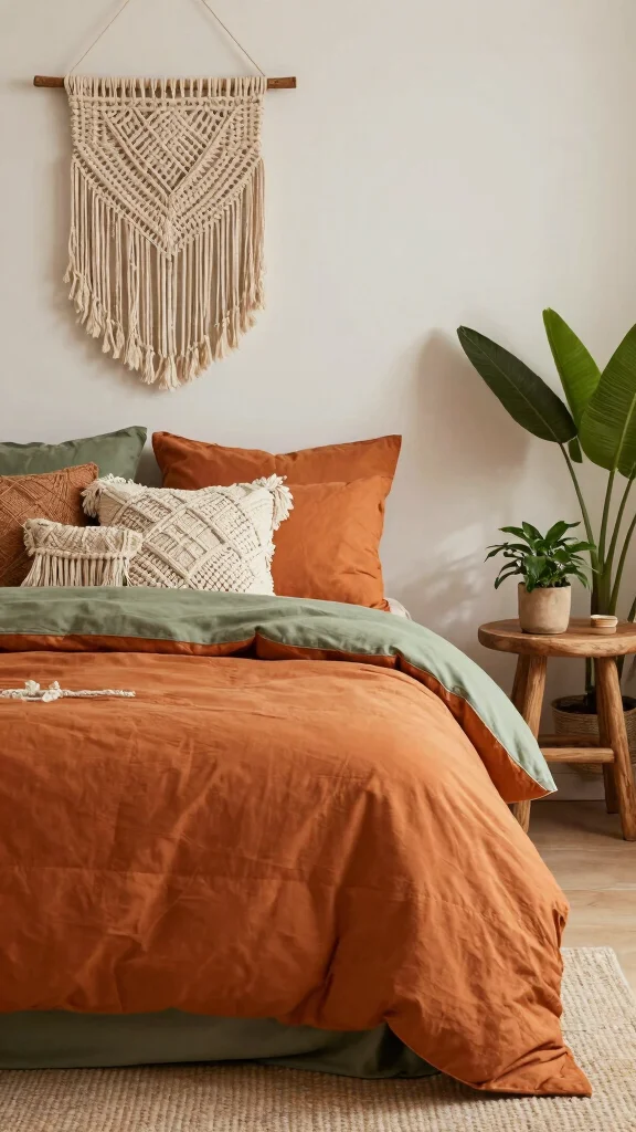 Incorporating burnt orange and green bedding into your bedroom decor can create a vibrant, inviting space that reflects your eclectic bohemian style.