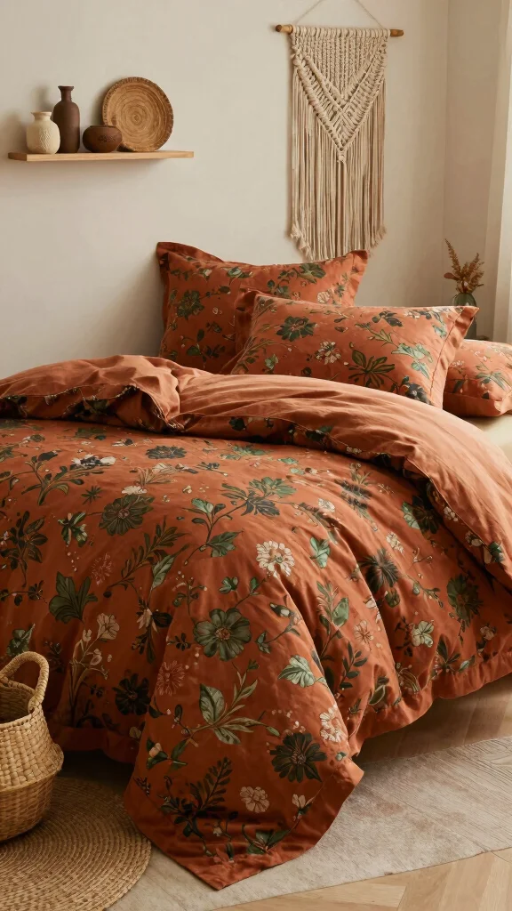 Floral patterns breathe life into your bedding, offering a delightful nod to bohemian style. Imagine a duvet cover adorned with vibrant burnt orange flowers set against a deep green backdrop. This bold contrast not only captivates the eye but also invites the beauty of nature indoors.