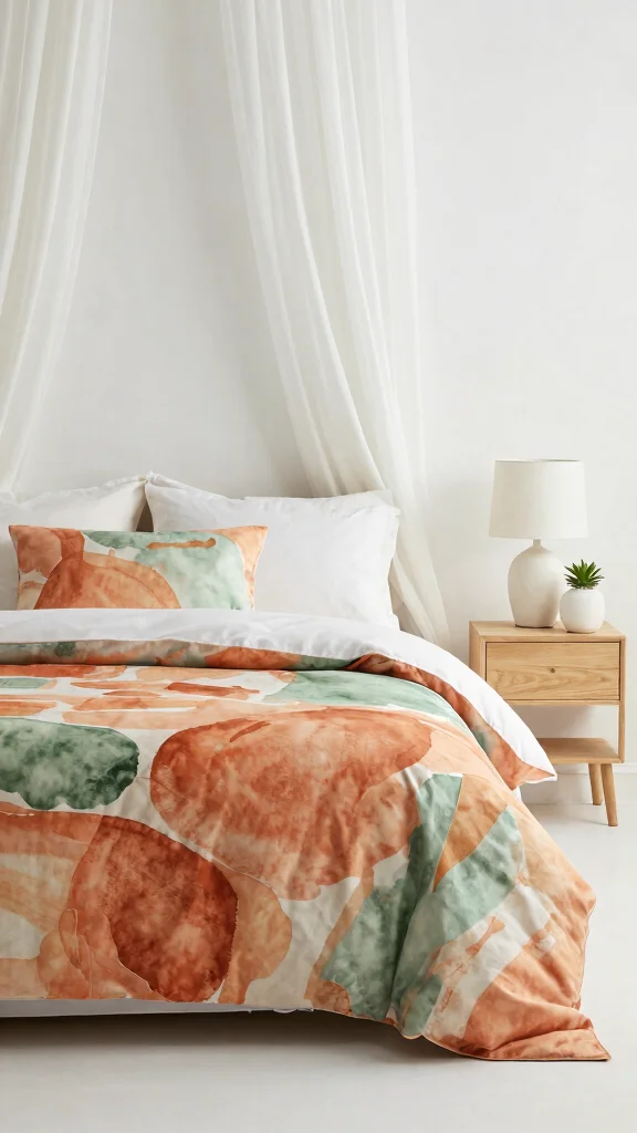 Watercolor designs bring a dreamy, artistic essence to your bedding. Choose a duvet cover featuring an abstract watercolor print in harmonious burnt orange and green shades. This style creates a serene atmosphere that transforms your bedroom into a peaceful retreat.