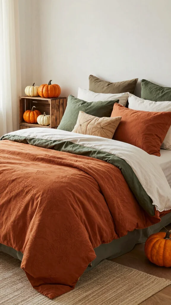 Refreshing your bedding with seasonal changes keeps your space lively and inviting. In fall, introduce burnt orange and deep green shades for warmth and coziness. Add seasonal throws or cushions featuring autumn motifs to enhance the look.