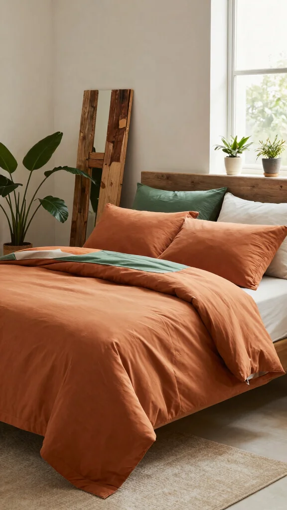 Keep the palette consistent across seasons. For spring/summer, choose breathable cotton or linen with a lighter green or a soft burnt orange accent; a subtle floral or botanical print works well. In autumn/winter, layer with a heavier quilt or velvet in burnt orange; add forest green or olive accessories. Use the same color family throughout and vary textures rather than switching palettes. For bedroom decor, rotate textiles so you still feel cohesive year-round. Quick tip: store out-of-season pieces neatly and swap in new textures rather than new colors.